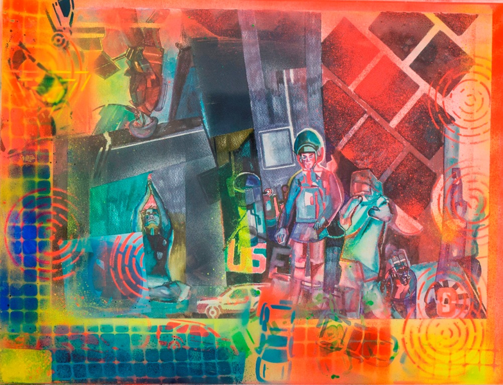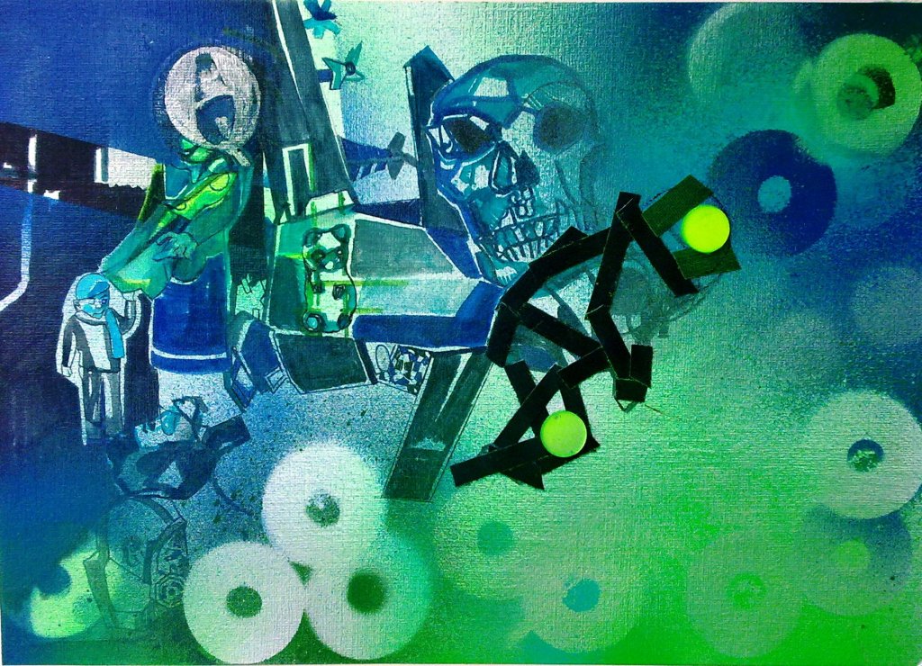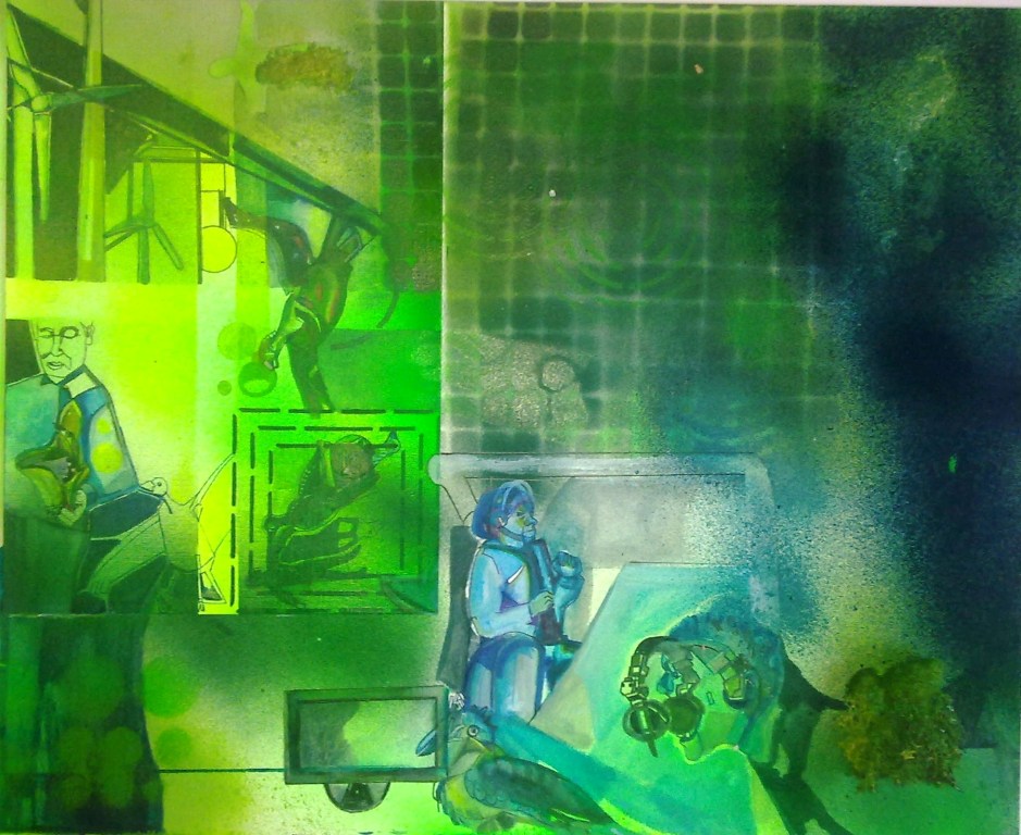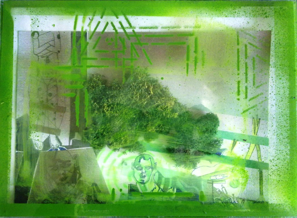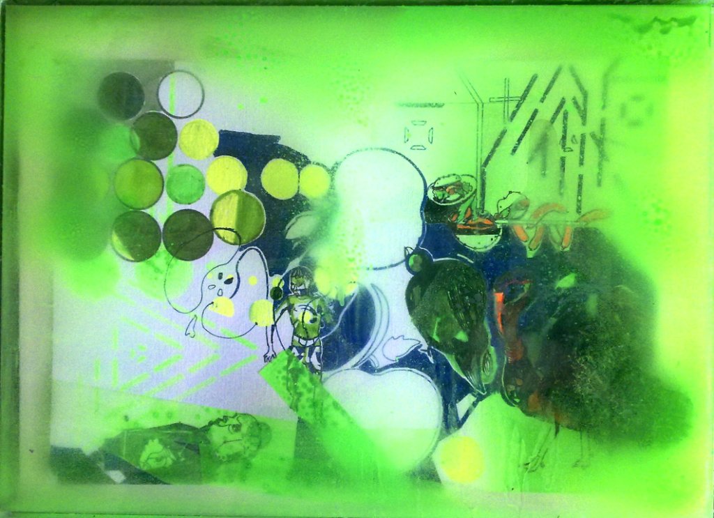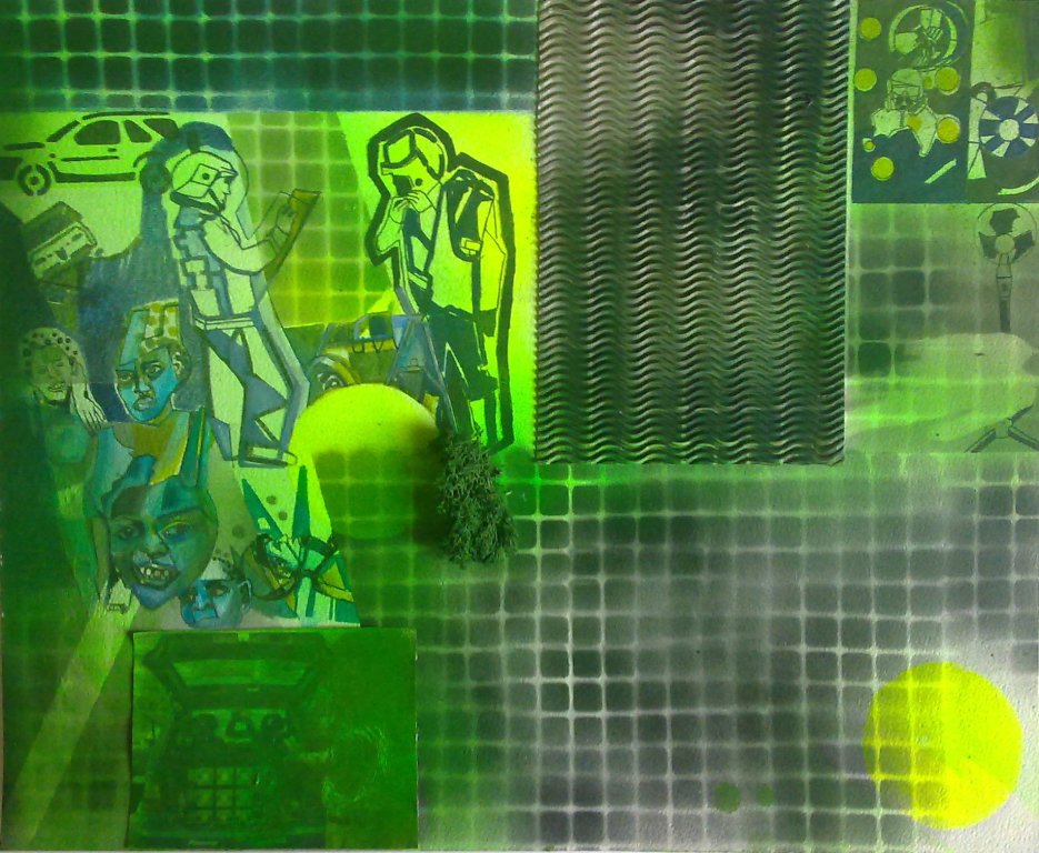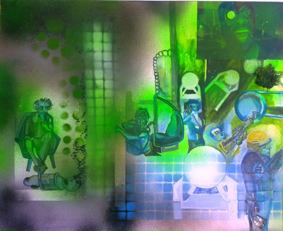 Bereits die Verwendung von Spray-Lack verweist auf Praktiken der Straßenkultur, auf künstlerische Revolte und Widerstand, wie sie der „street art“ eigen ist, wobei der Gebrauch von starken, exaltierten Farben, vor allem eines verseuchenden Grüns, trotz seiner aquarellistischen Verwendung, entspannend wirkt und die bevorstehende Katastrophe ankündigt.