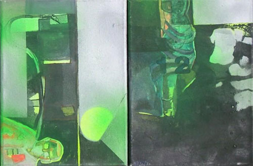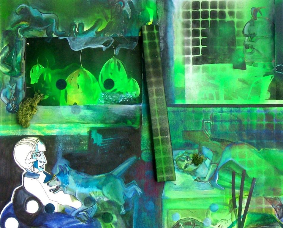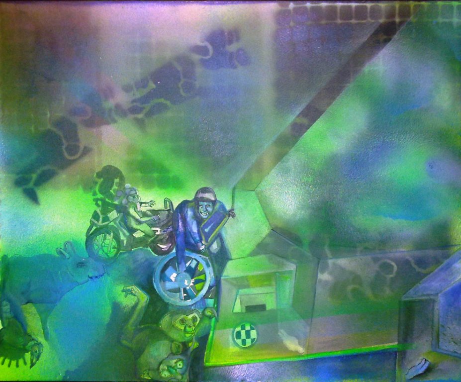 Figuren und Objekte, dargestellt in harten, offensiven Formen, erinnern an Science-Fiction-Filme. Diese Figuren und Objekte ersticken im Rahmen ihrer verseuchten Leinwand oder vom Gewicht voluminöser Plakatfarben, die schwer auf ihnen lasten. Oft spielt der Raum eine zentrale Rolle bei der Gestaltung und Aufteilung der Malfläche sowie auch bei der Struktur des Narrativen. Fenster – metaphysische Entfliehungsöffnungen – im Raumzusammenhang mit den menschlichen Gestalten, eingefügt inmitten eines eigenartigen theatralischen Dämmerlichtes, verleihen eine Schrecknuance.