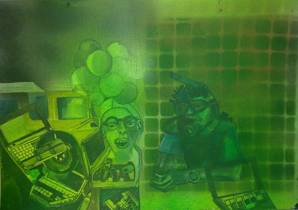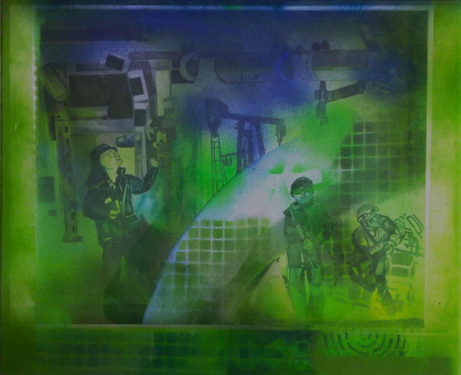 Ήδη η επιλογή του spray σαν ζωγραφικό μέσο, παραπέμπει σε πρακτικές της κουλτούρας του δρόμου, της καλλιτεχνικής αντίδρασης και αντίστασης της street art ενώ η χρήση έντονων χρωματικών εξάρσεων, ιδιαίτερα αυτού του μολυσματικού πράσινου, αν και είναι δουλεμένο με ένα ακουαρελίστικο τρόπο έτσι ώστε να χαλαρώνει λίγο την σύνθεση, τελικά καταγγέλλει την επερχόμενη καταστροφή.