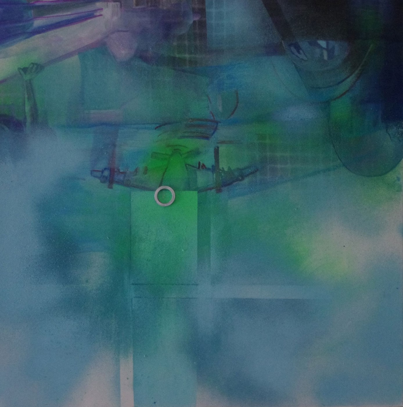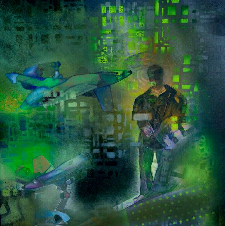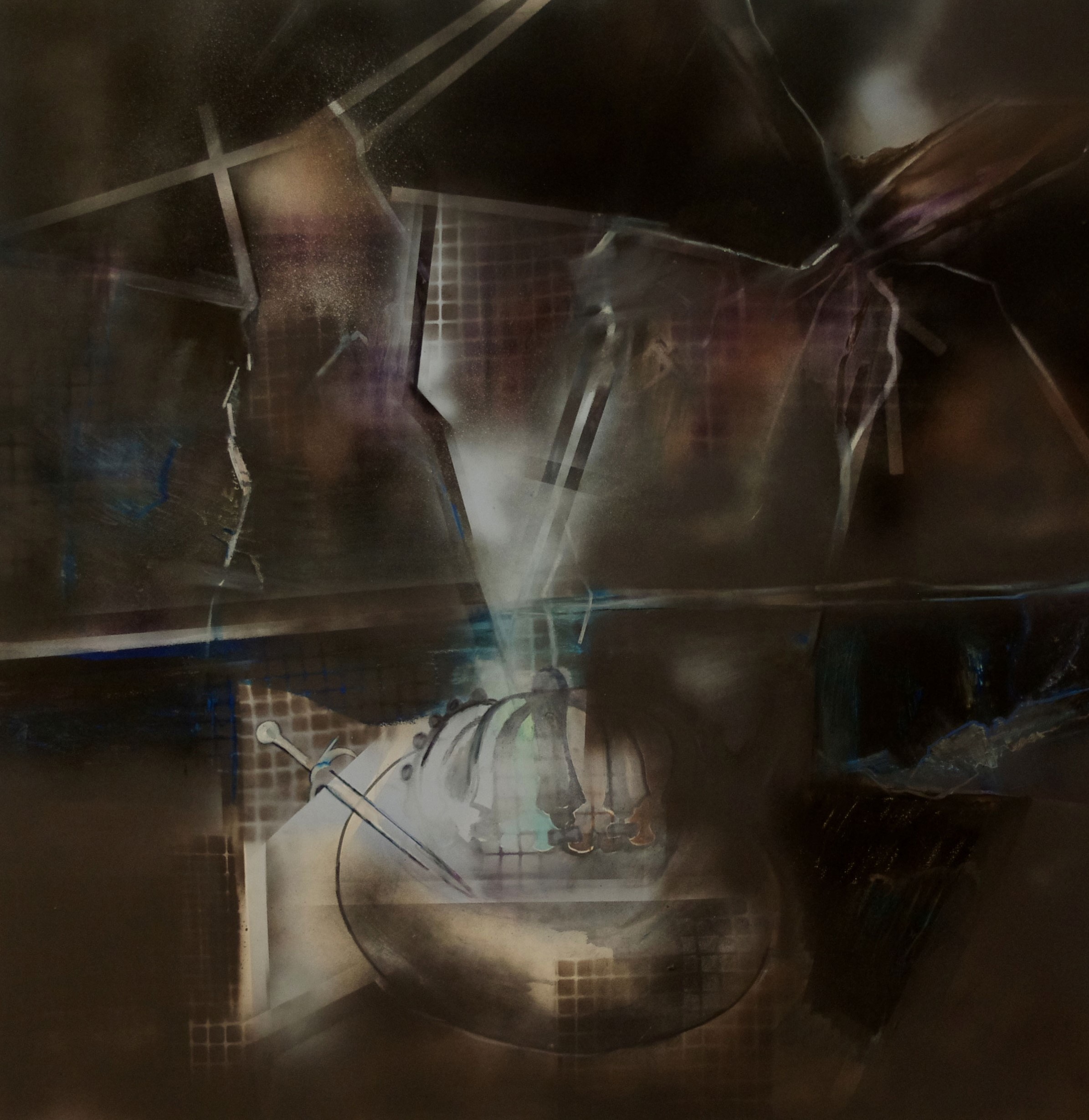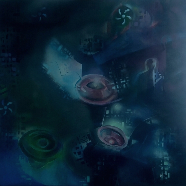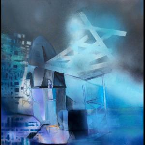 The artist Alexandra Marati strives to explore ‘wildernesses of unknown dimensions, often affected by extreme weather conditions in spiritual flux’. Using sprays and acrylics for the sandy or sticky veneer they provide, she creates ‘multiple levels of shifting sand that are both transient and permanent. Her work is a visual-spatial repository depicting aura-tinted flying objects, spectral forms or geometric shapes. Here and there, sudden voids intensify the sense of loss or impending doom … Oddly built structures lend artistic form to archetypal visions generated by the unconscious or are inspired by elements from nature itself. The unknown of the outer world is linked to the inner unknown, challenging viewers to come along on this journey under their own … steam’.