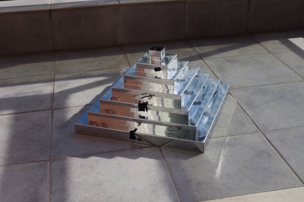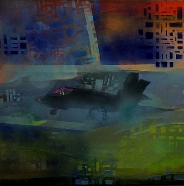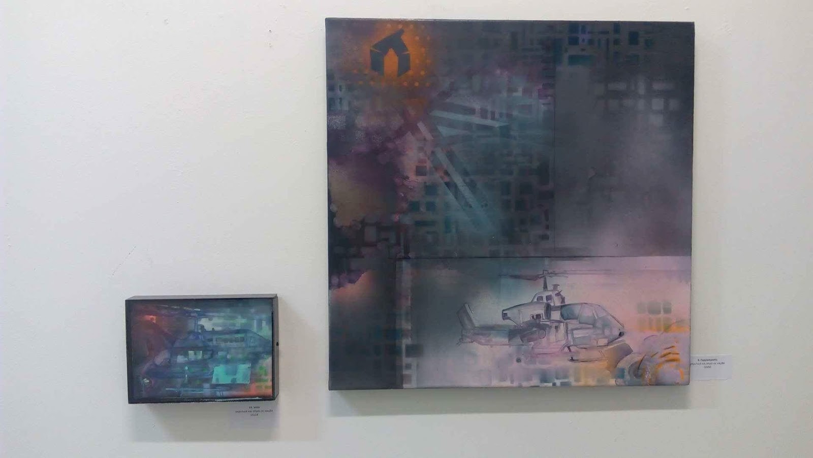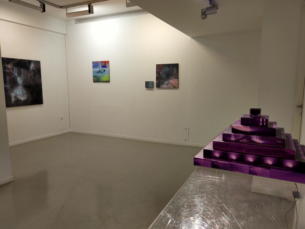 The artist Alexandra Marati strives to explore ‘wildernesses of unknown dimensions, often affected by extreme weather conditions in spiritual flux’. Using sprays and acrylics for the sandy or sticky veneer they provide, she creates ‘multiple levels of shifting sand that are both transient and permanent. Her work is a visual-spatial repository depicting aura-tinted flying objects, spectral forms or geometric shapes. Here and there, sudden voids intensify the sense of loss or impending doom … Oddly built structures lend artistic form to archetypal visions generated by the unconscious or are inspired by elements from nature itself. The unknown of the outer world is linked to the inner unknown, challenging viewers to come along on this journey under their own … steam’.